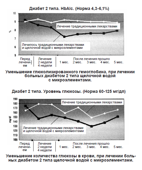 В Германии ученая Дина Ашбах (Dina Aschbach) исследовала действие щелочной воды, при приготовлении которой в нее были дополнительно введены микроэлементы (увеличена концентрация отдельных ионов). Клинические исследования показали, что употребление такой воды в течение 4 недель, заметно улучшило показатели, характеризующие состояние больных (количество глюкозы в крови, глюколизированный гемоглобин, потребность инсулина, гликованный гемоглобин и др.) Улучшение не прекращалось даже спустя 5 месяцев после лечения.