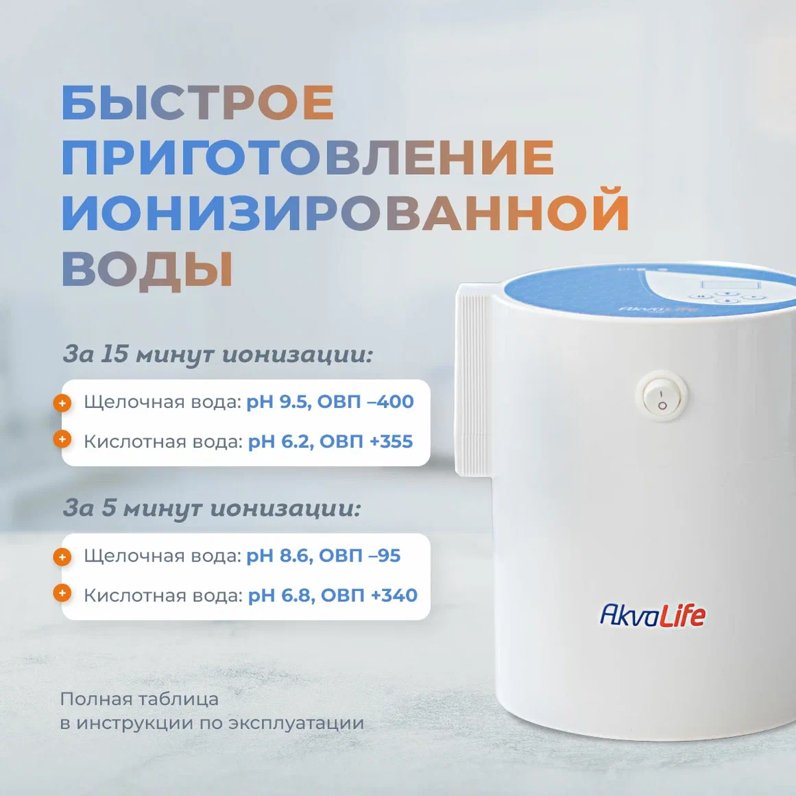 - Прибор позволяет приготовить 0,8 литра ионизированной щелочной воды и 0,6 литра ионизированной кислотной воды.