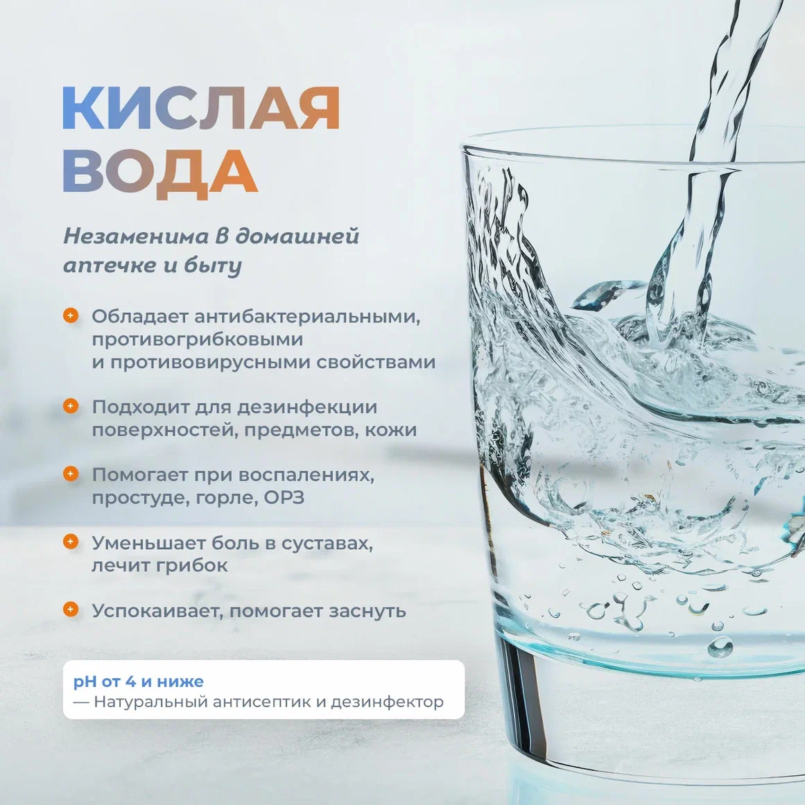 Умывайте лицо кислотной водой pН 5,0-6,0, эти значения соответствует кислотно-щелочному балансу нашей кожи. Такая вода подтягивает и смягчает кожу, а волосам при ополаскивании после мытья придаёт естественный блеск. Кислотная вода с рН 2,4-3,0 обладает антибактериальными, противовирусными и противовоспалительными свойствами, а также является сильным дезинфицирующим свойством. Успокаивает нервы, снижает кровяное давление и может быть эффективным средством от бессонницы.